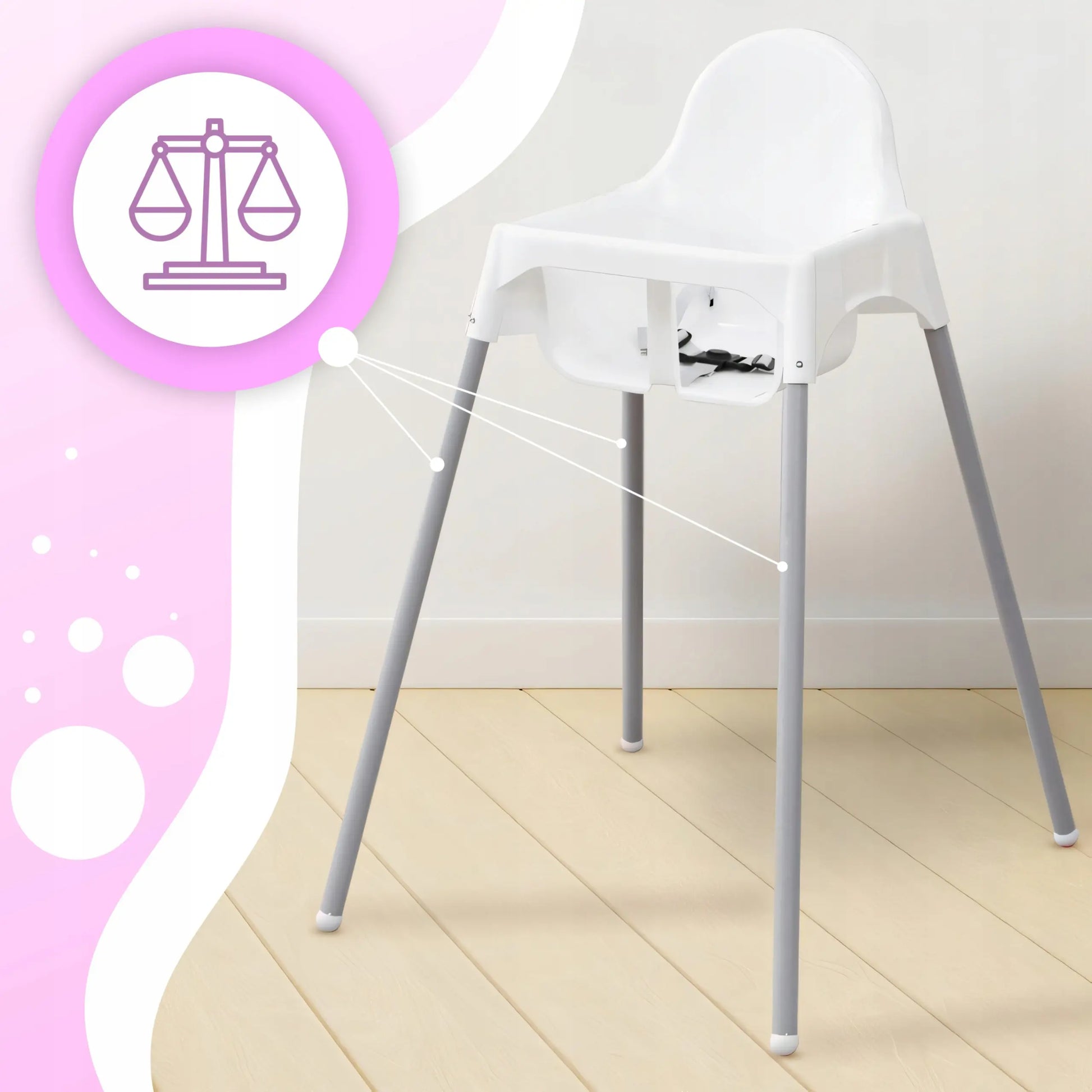 Благодаря белому цвету детский стульчик гармонично впишется в большинство интерьеров. Широкое основание и качественная накладка обеспечивают долгий срок службы без проблем, делая стул прочным. Он изготовлен из алюминия и АБС-пластика, что гарантирует устойчивость к механическим повреждениям.