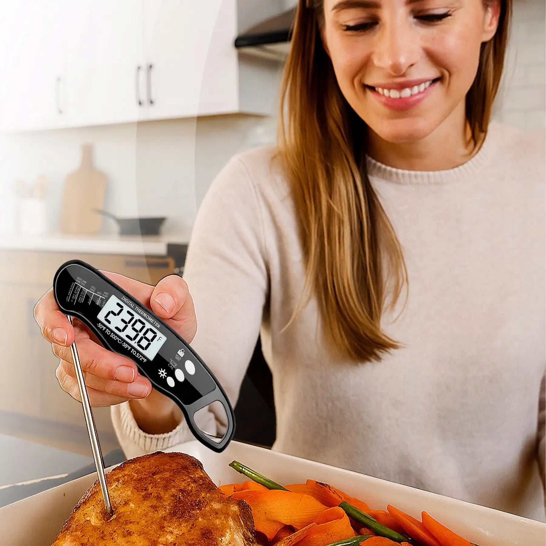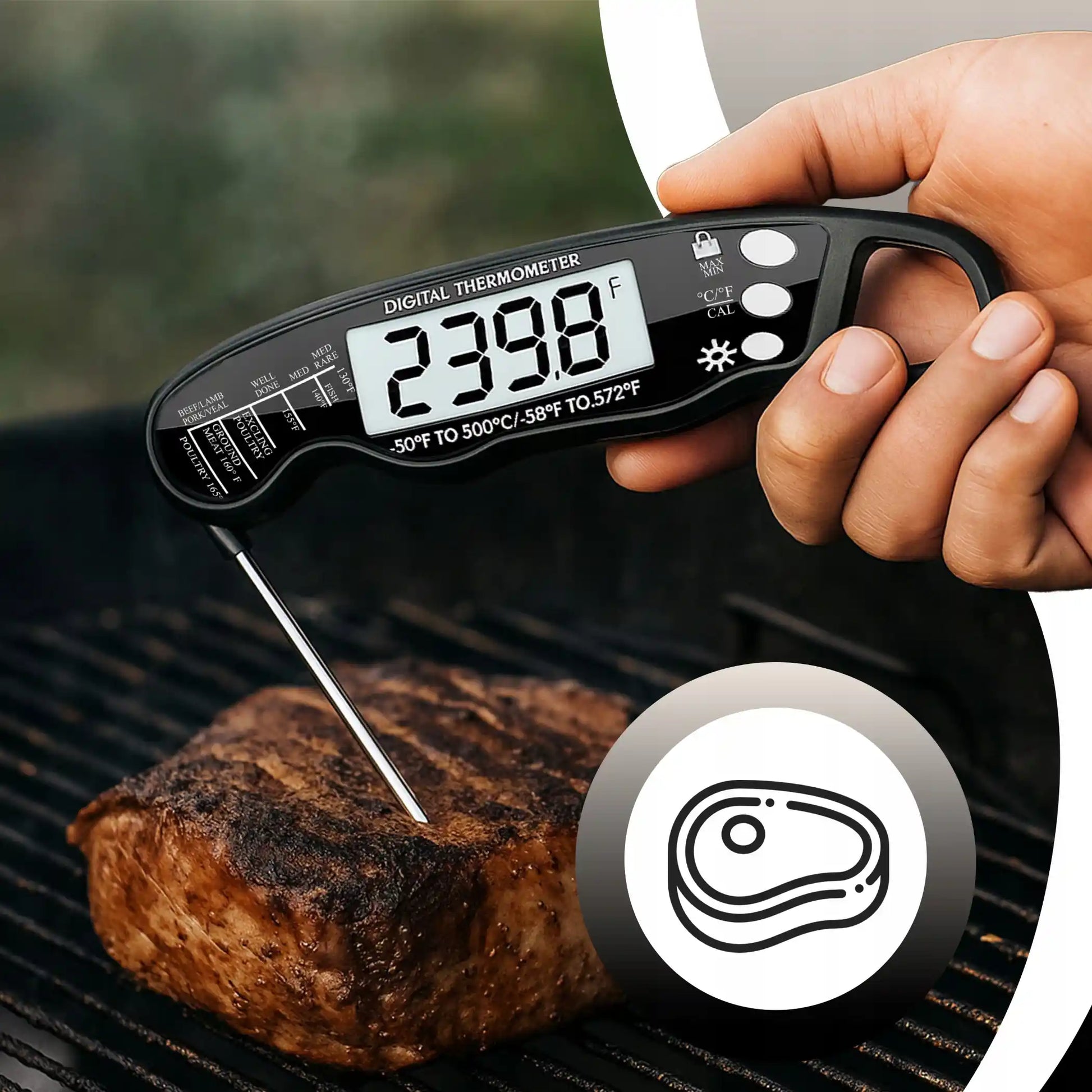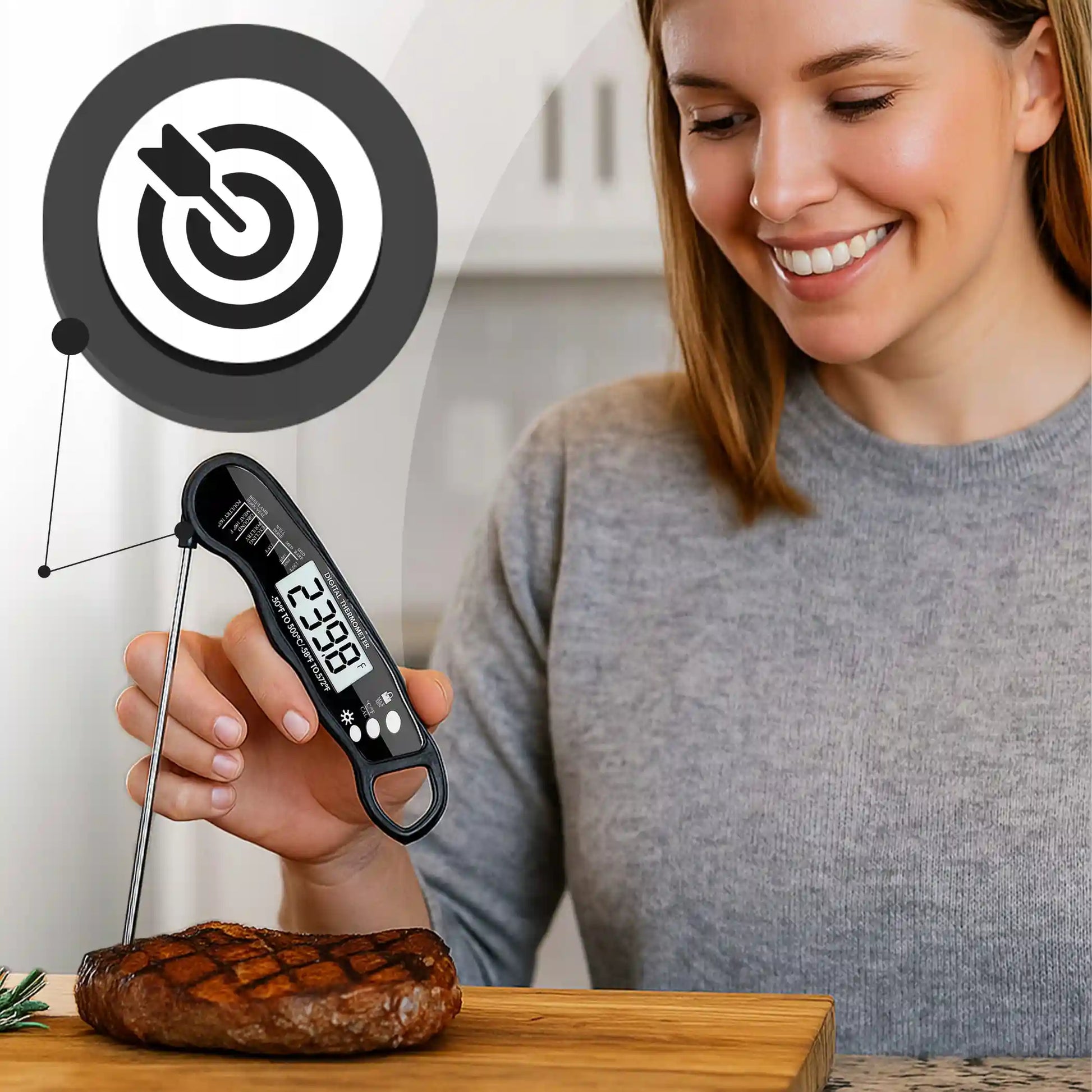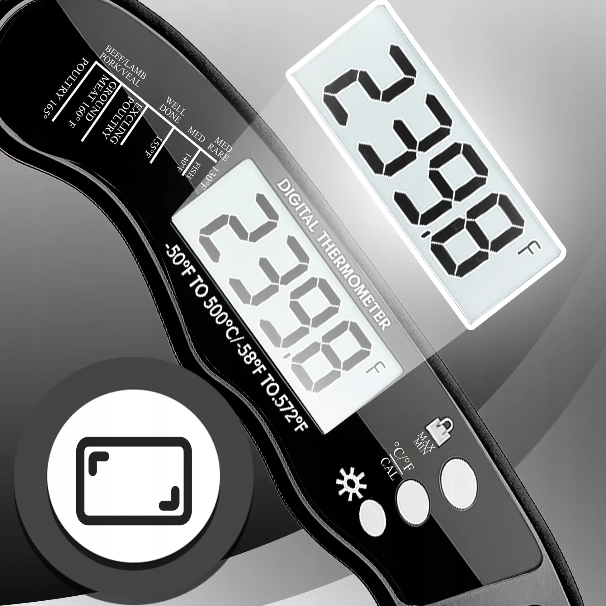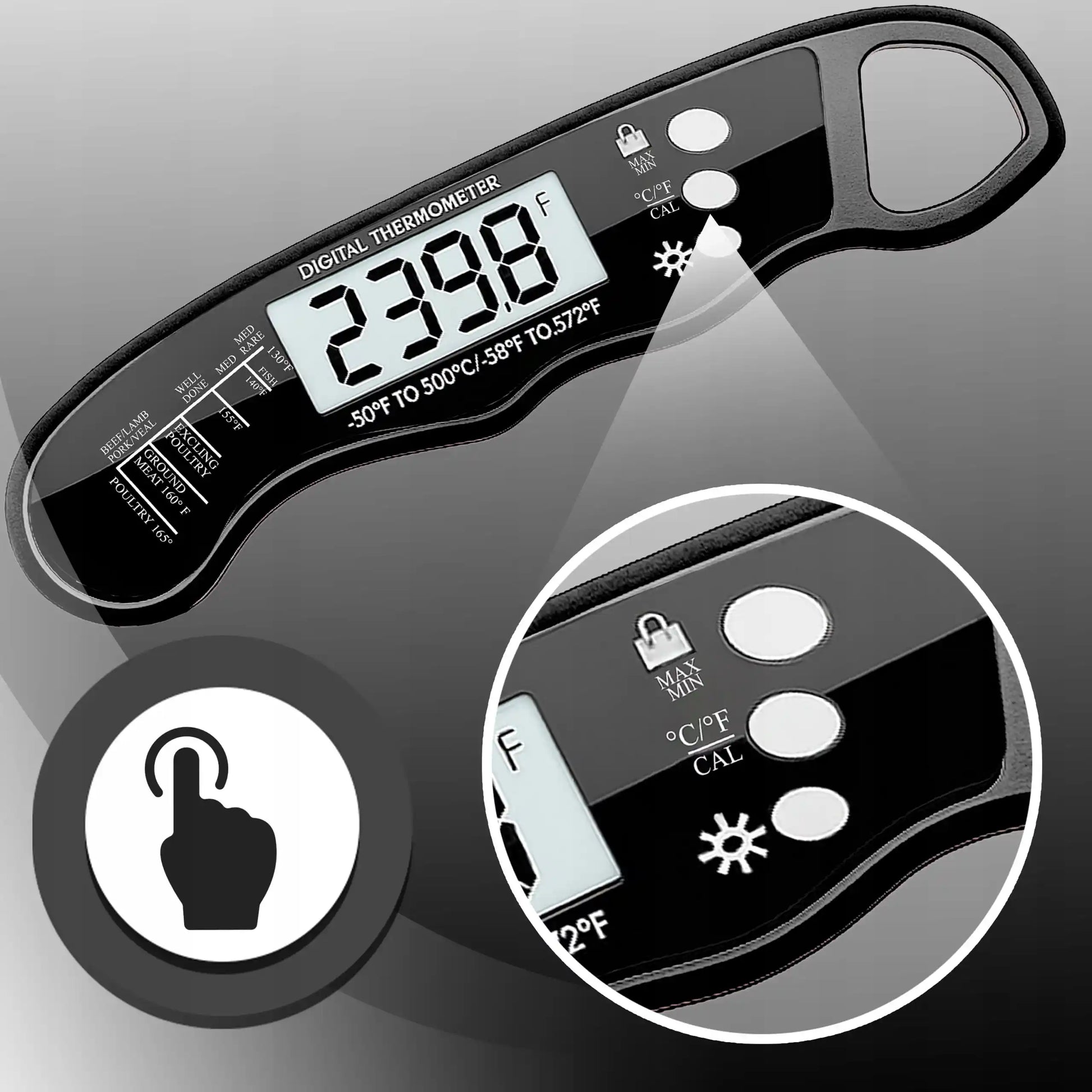 Термометр оснащён встроенным магнитом, что позволяет легко прикрепить его к металлическим поверхностям, например, к холодильнику или духовке. Благодаря этой практичной функции он всегда будет под рукой, что облегчает использование во время приготовления пищи. Вам больше не придётся беспокоиться о том, куда его положить — термометр всегда будет на виду и готов к использованию в любой момент. Подсветка экрана обеспечивает лёгкое считывание температуры даже в тёмных помещениях, позволяя легко проверить температуру пищи в любое время суток.